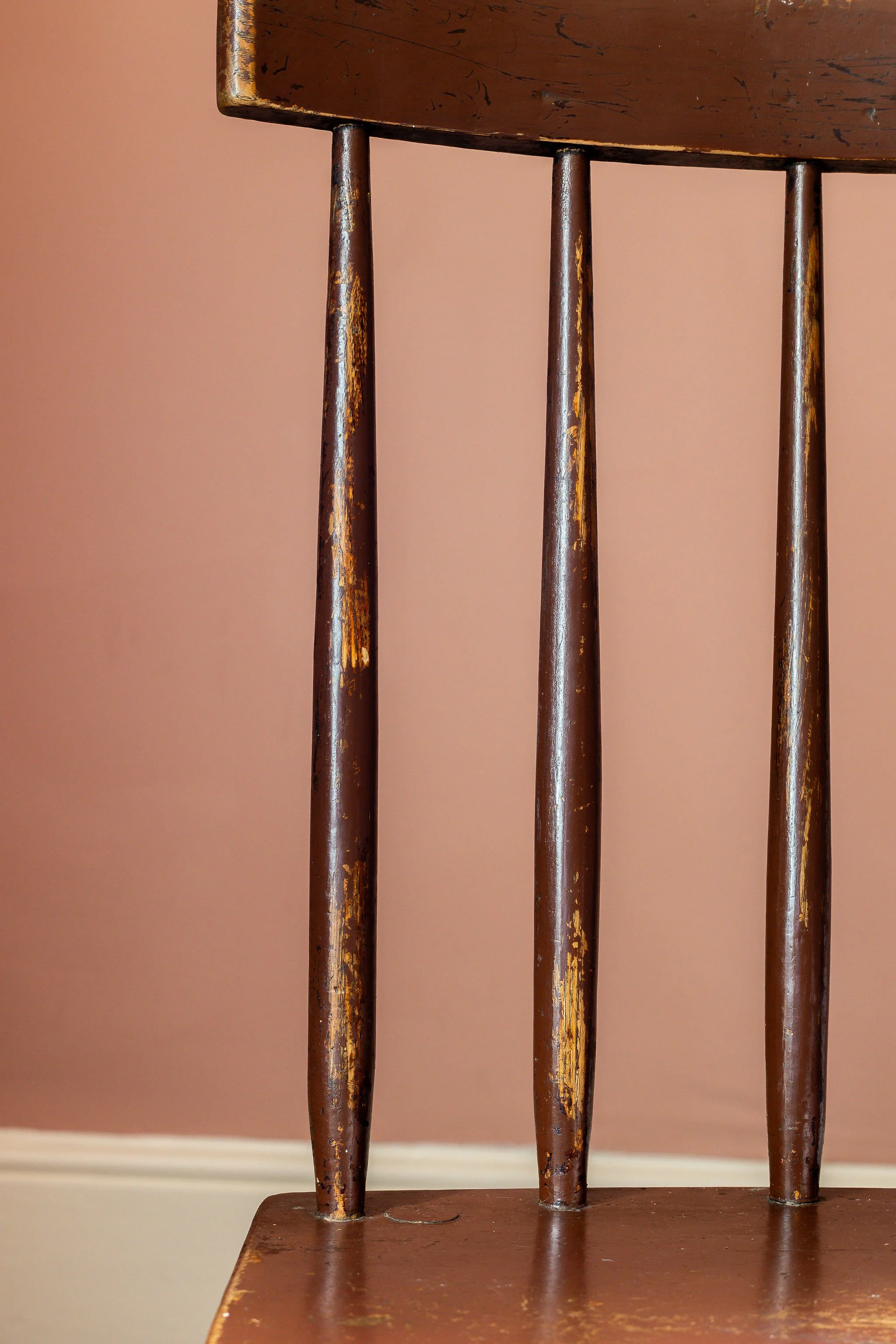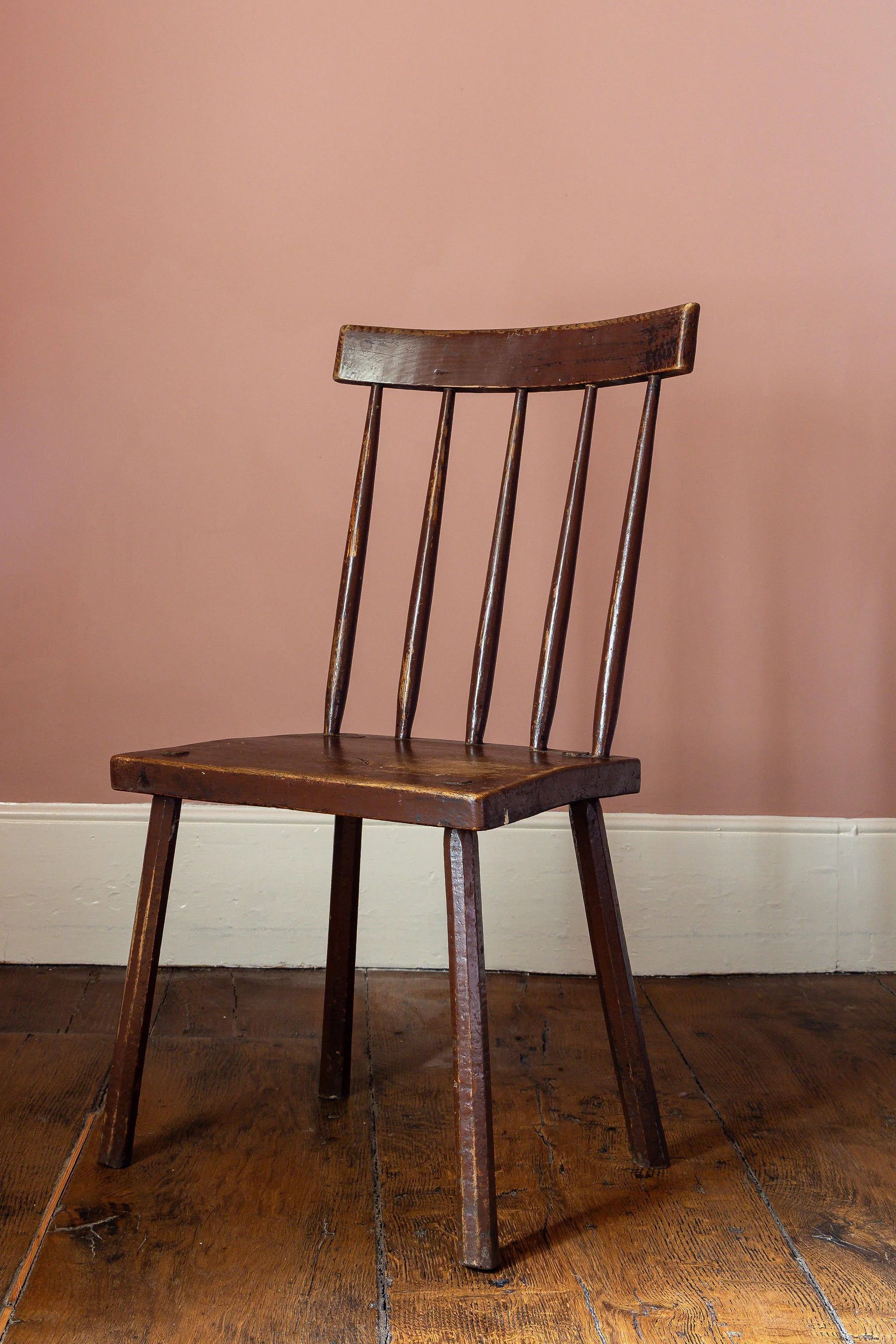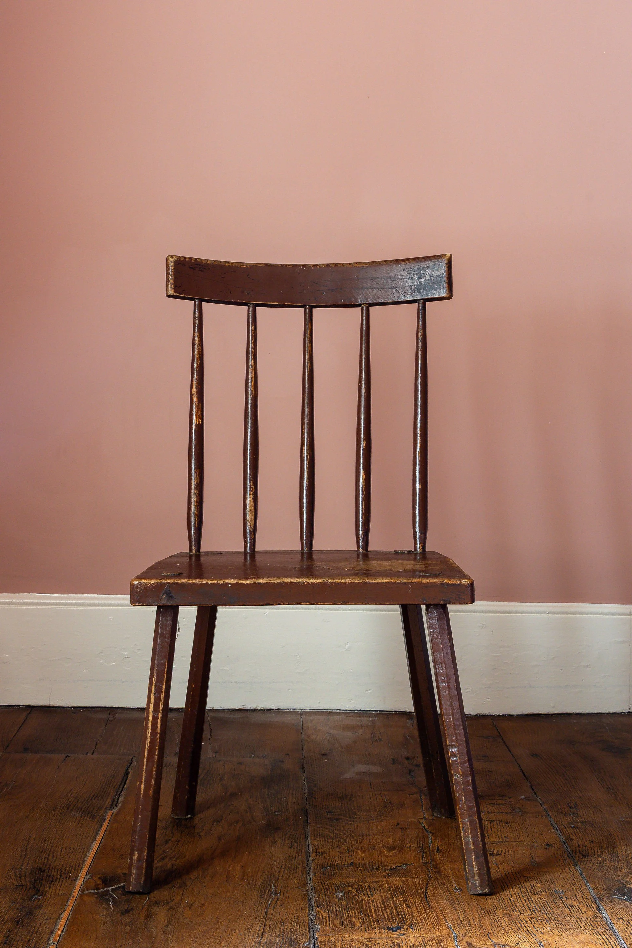 Retaining its original reddish brown paint, this pleasingly proportioned Irish hedge chair has a curved crest rail, spindle back, and panelled seat, on gently out-swept legs. A typical and evocative piece of Irish vernacular seating.