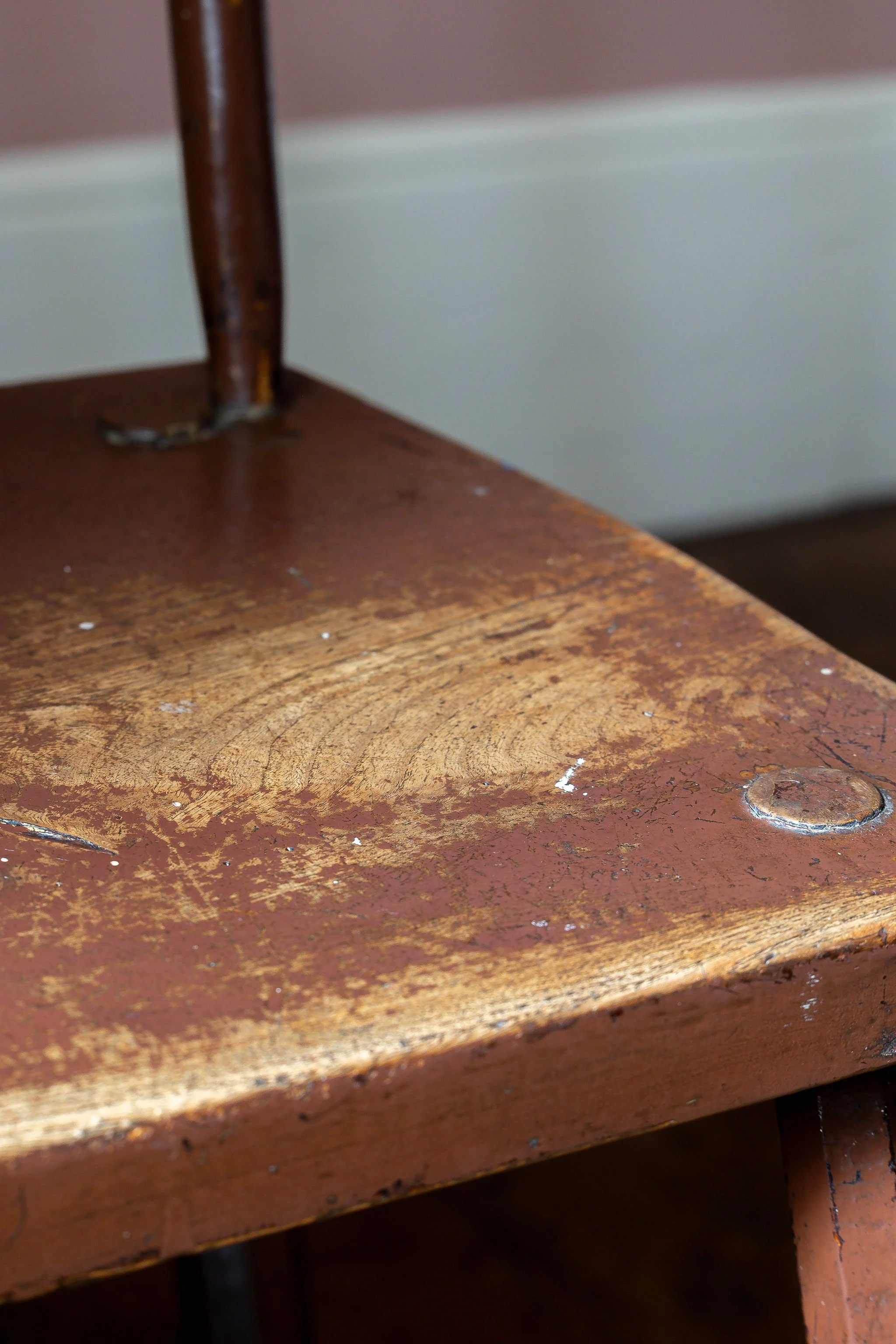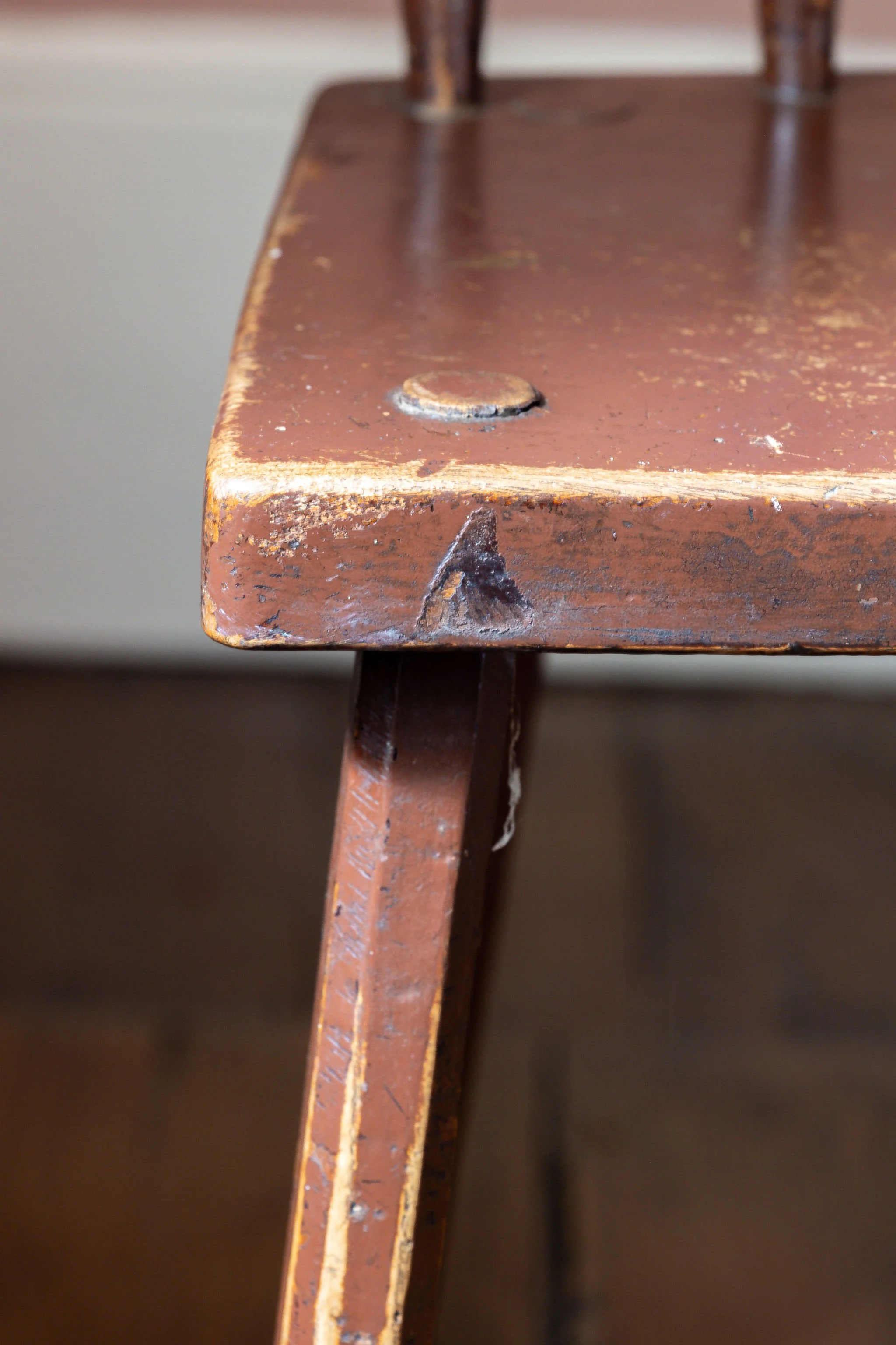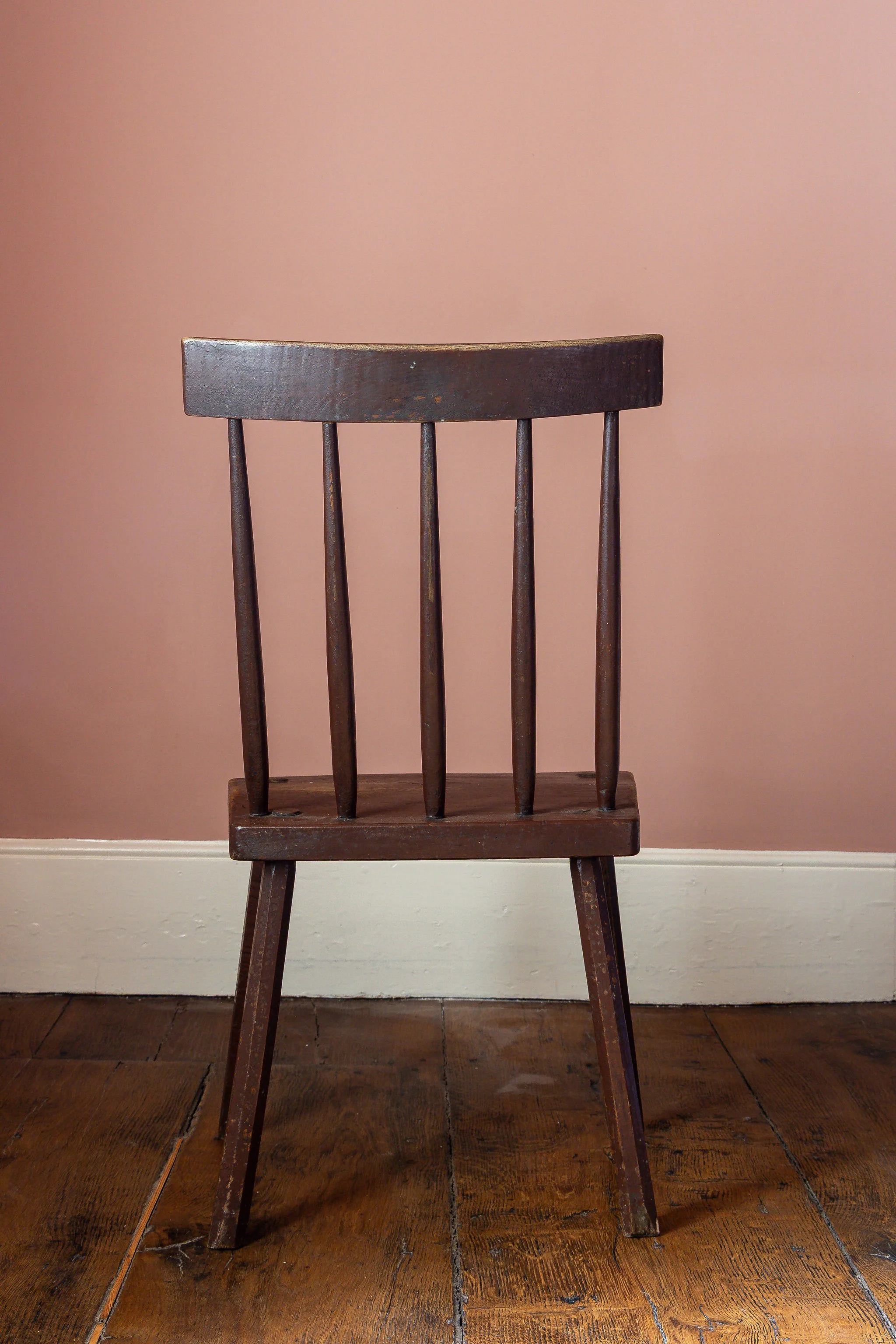Retaining its original reddish brown paint, this pleasingly proportioned Irish hedge chair has a curved crest rail, spindle back, and panelled seat, on gently out-swept legs. A typical and evocative piece of Irish vernacular seating.